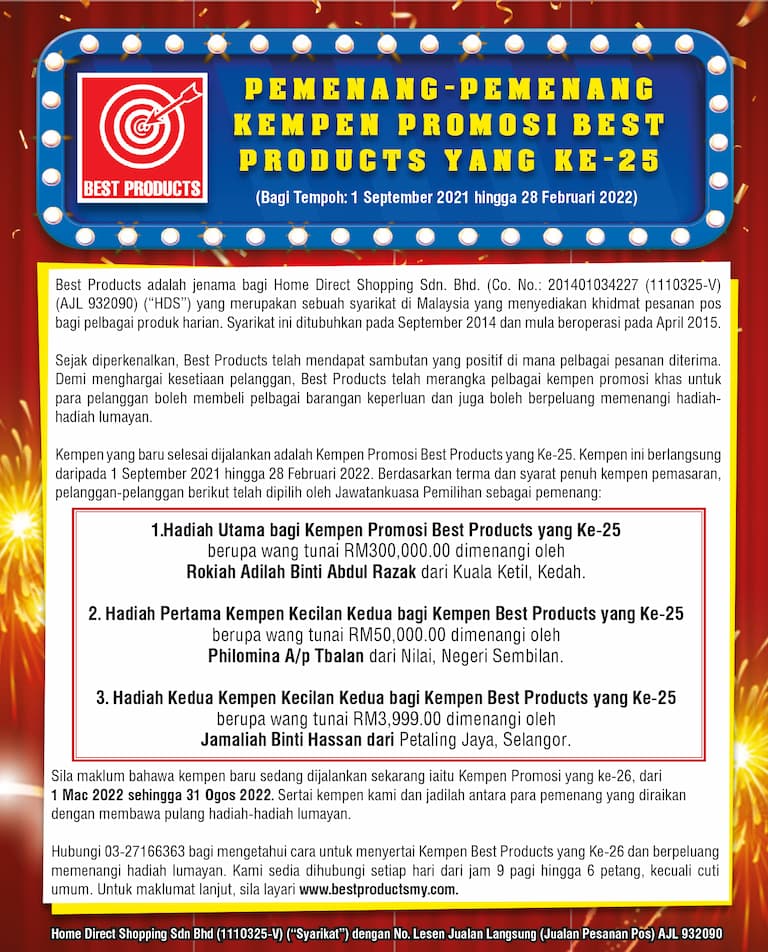 Best Products adalah sebuah jenama Home Direct Shopping Sdn. The grand prize winner was Suhaiza Sidek from. Is a company registered with Suruhanjaya Syarikat Malaysia and and is issued with the registration number 1110325-V for its business operation.